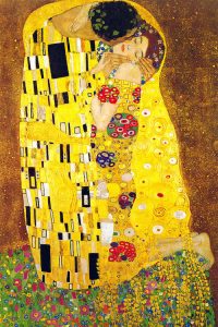 In Dutch Art gold is synonymous with money, presenting the present but a reminder of the after life. The Money Changer and His Wife has moral undertones with its scales, snuffed out candle and rosary beads next to an apple, symbol of all evil. Klimt worked with different types of gold, catching light in different ways. There seems an inner light within the canvas in The Kiss.