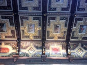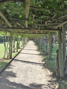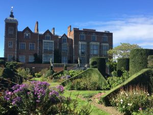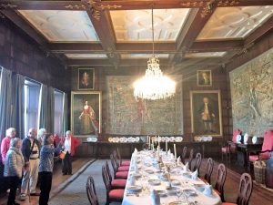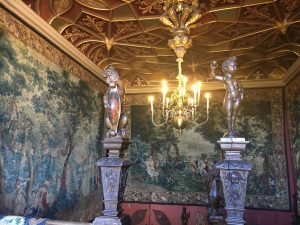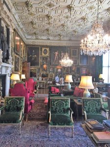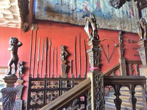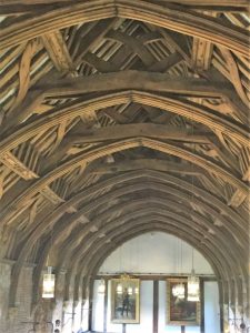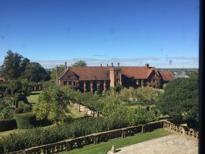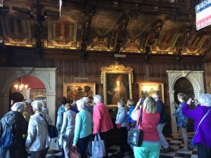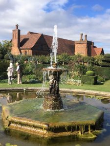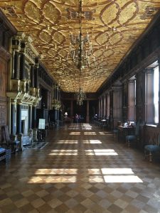 Hatfield House – South FrontApproaching the House……past the moving fountain – the golden ball and arms rise and fallThe Marble Hall with guide RosCeiling of Marble HallMarble HallThe rainbow portrait of Queen ElizabethStaircase with carved wooden dog gate!