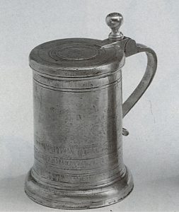 During the 18th Century, with the introduction of porcelain and mass production of glass and pottery, pewter’s popularity waned, also because of its unhealthy lead content. Porcelain was welcomed as being hygienic, clean and attractive, Pewter became sidelined and increasingly associated with the vintners, wine and beer trade. Pewter measures were used to take wine from barrels. Pewter also became increasingly used by modest or poor families, though it was also used in furniture making and in supports for glass ware.
